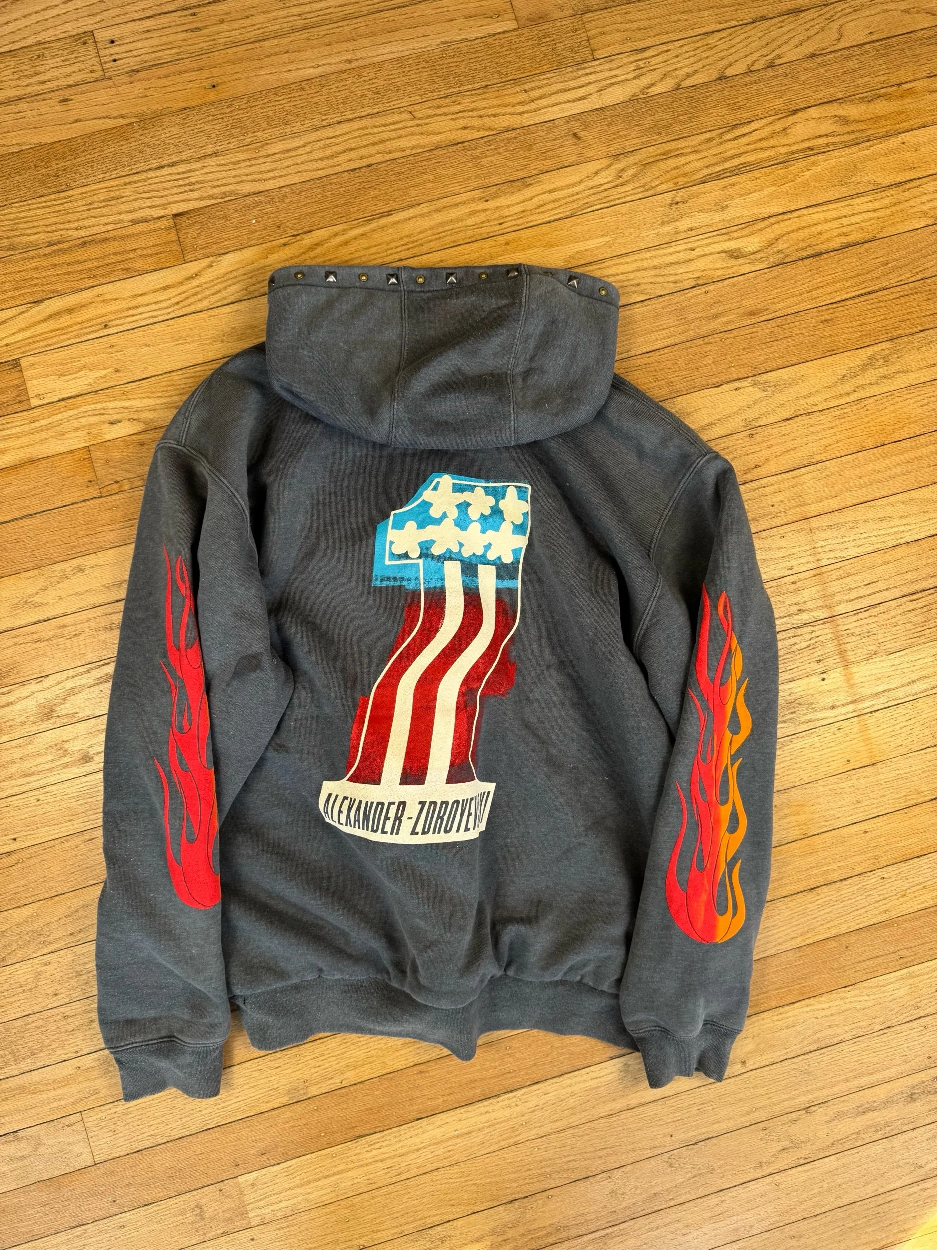 Hand pressed Rivets and studs around pocket and hood