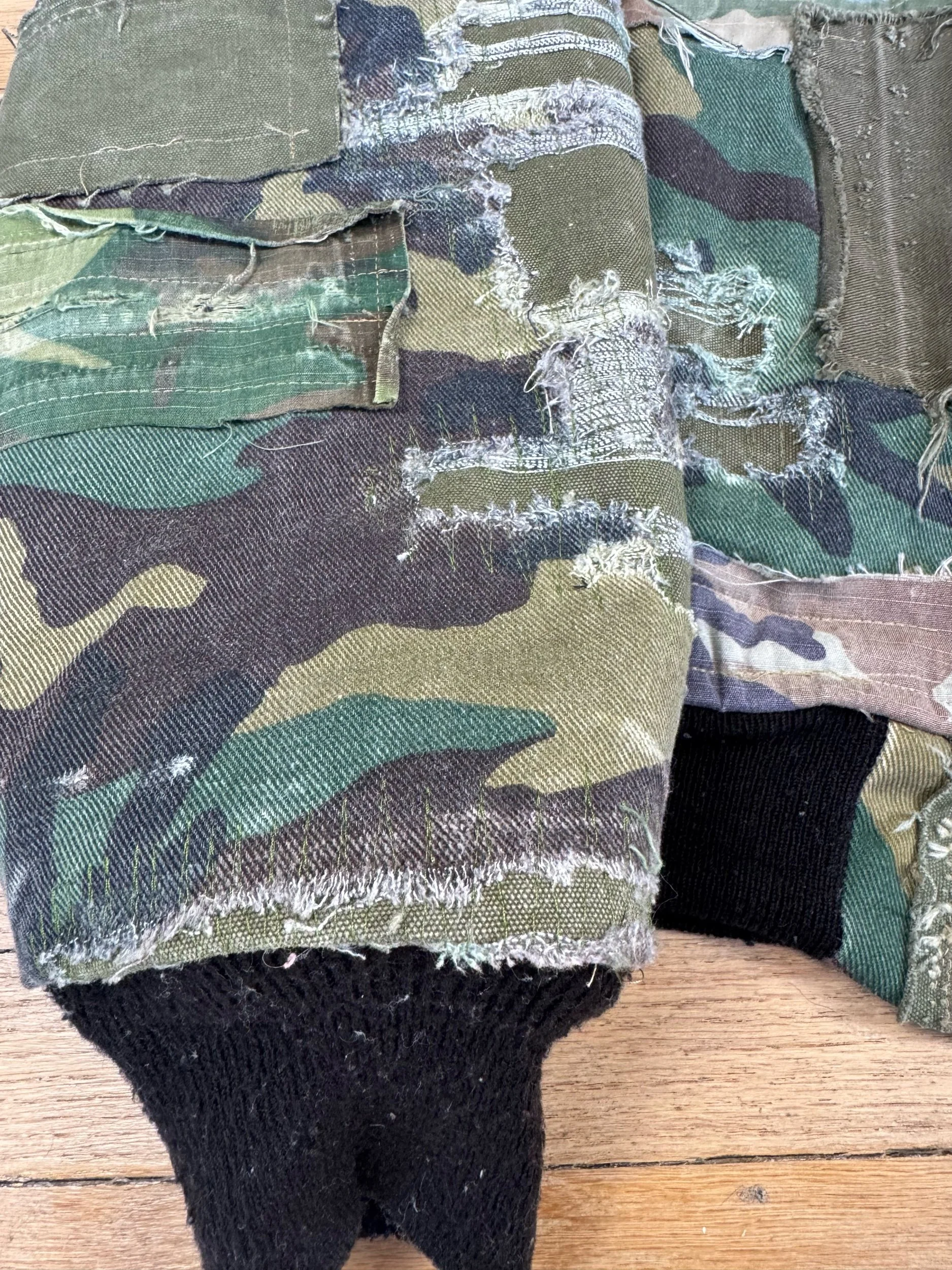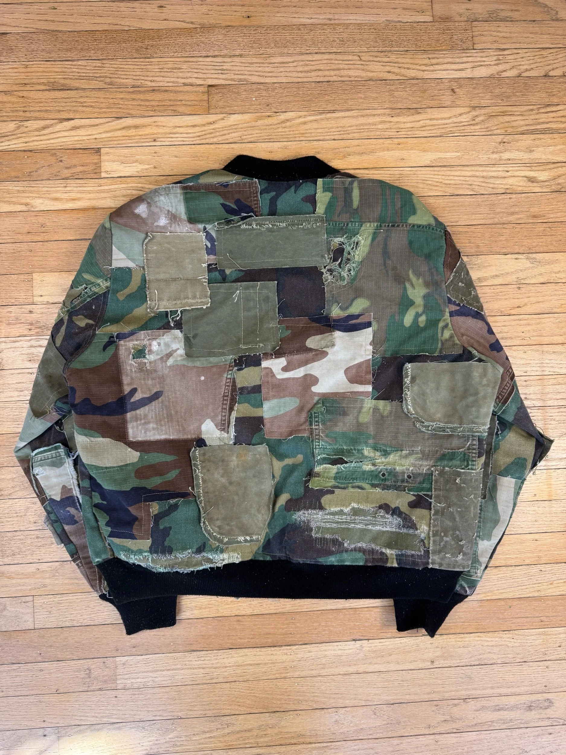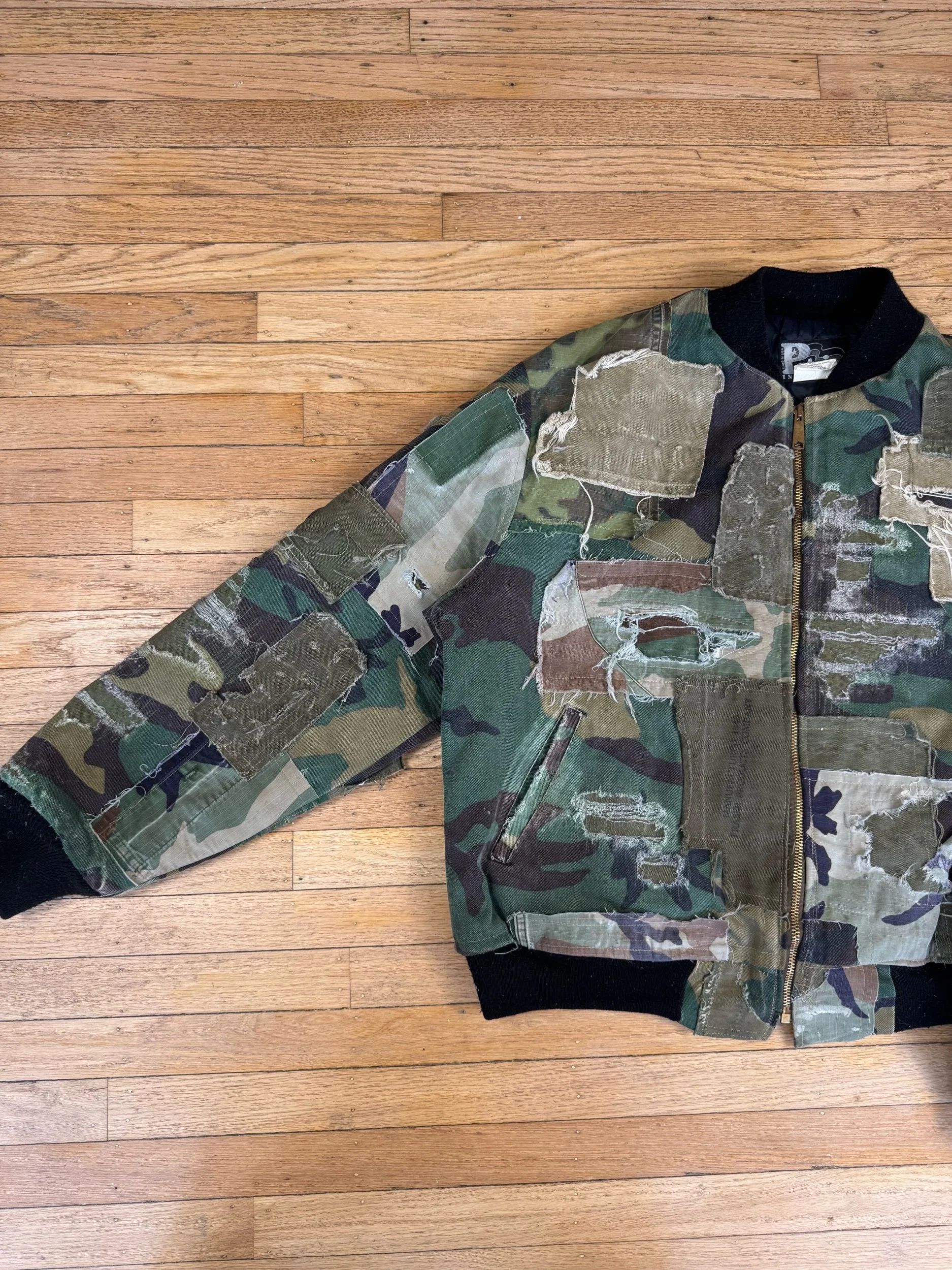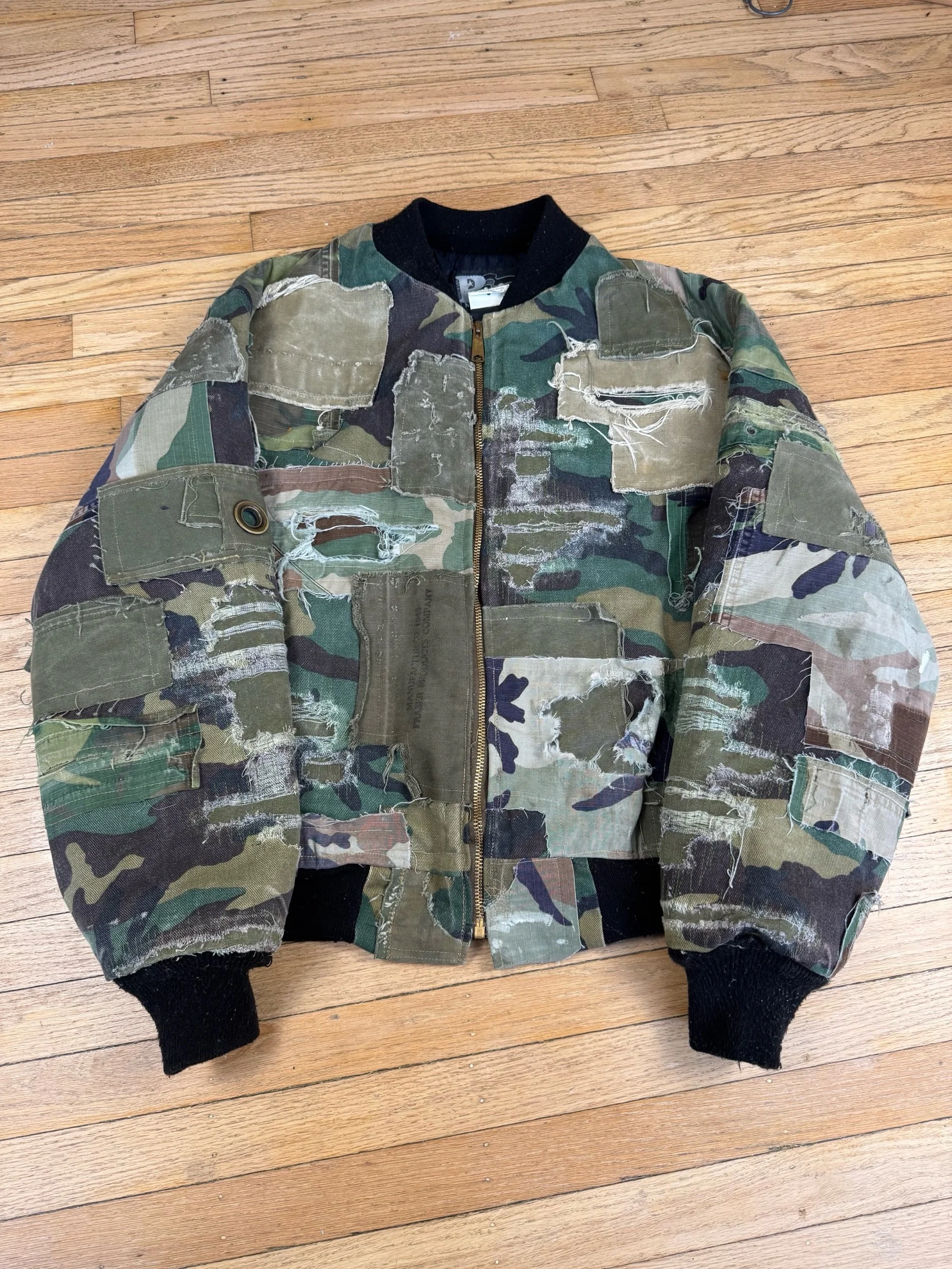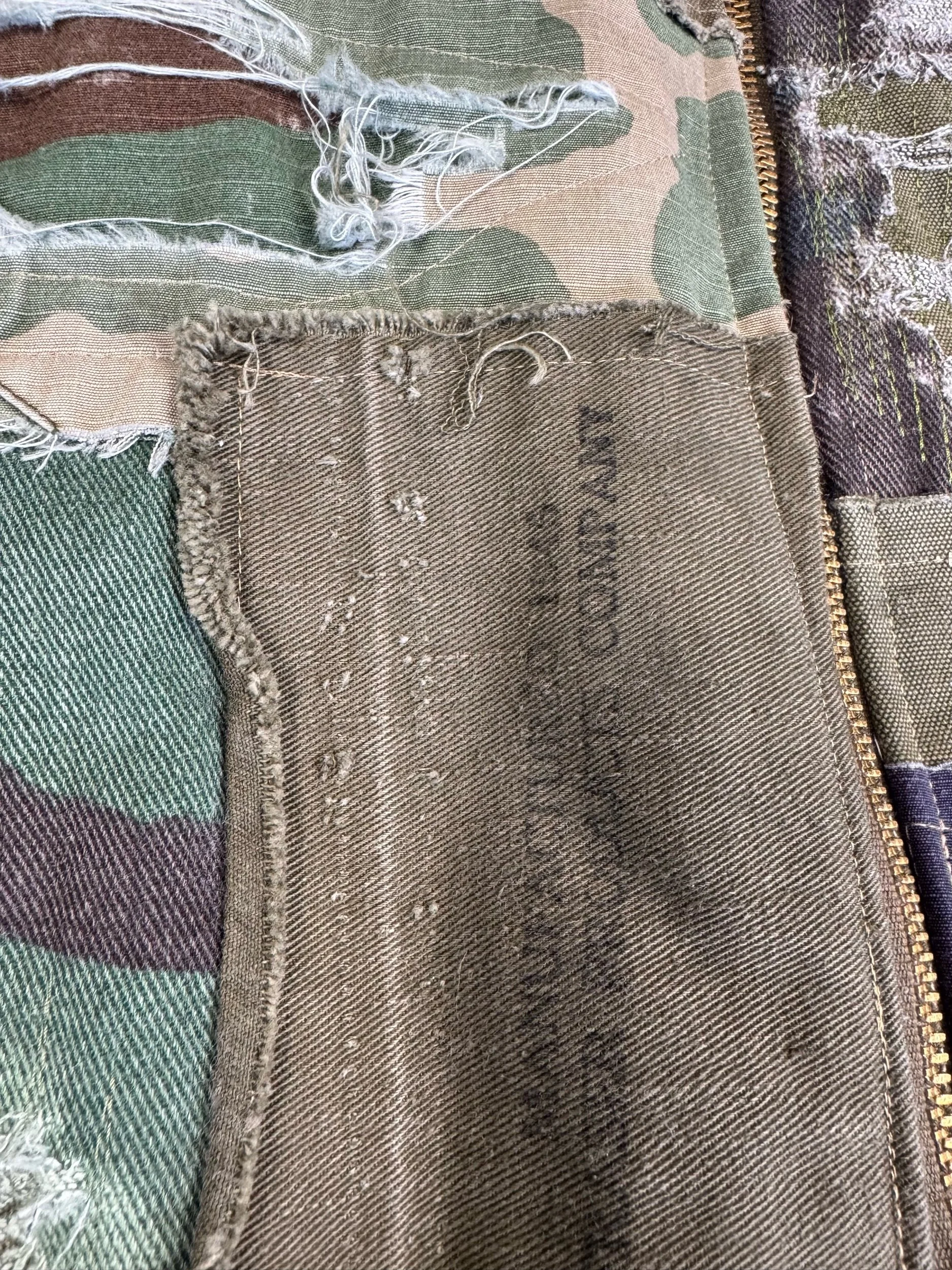 Vintage denim, camo bomber jacket, completely deconstructed and covered in multiple types of subtly different camos taken from vintage faded distressed pants. Fabrics from 1940’s coveralls and military duffle bags