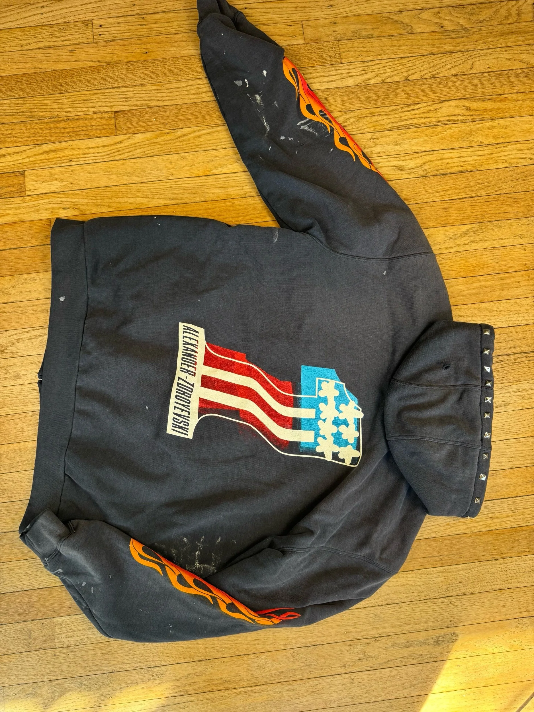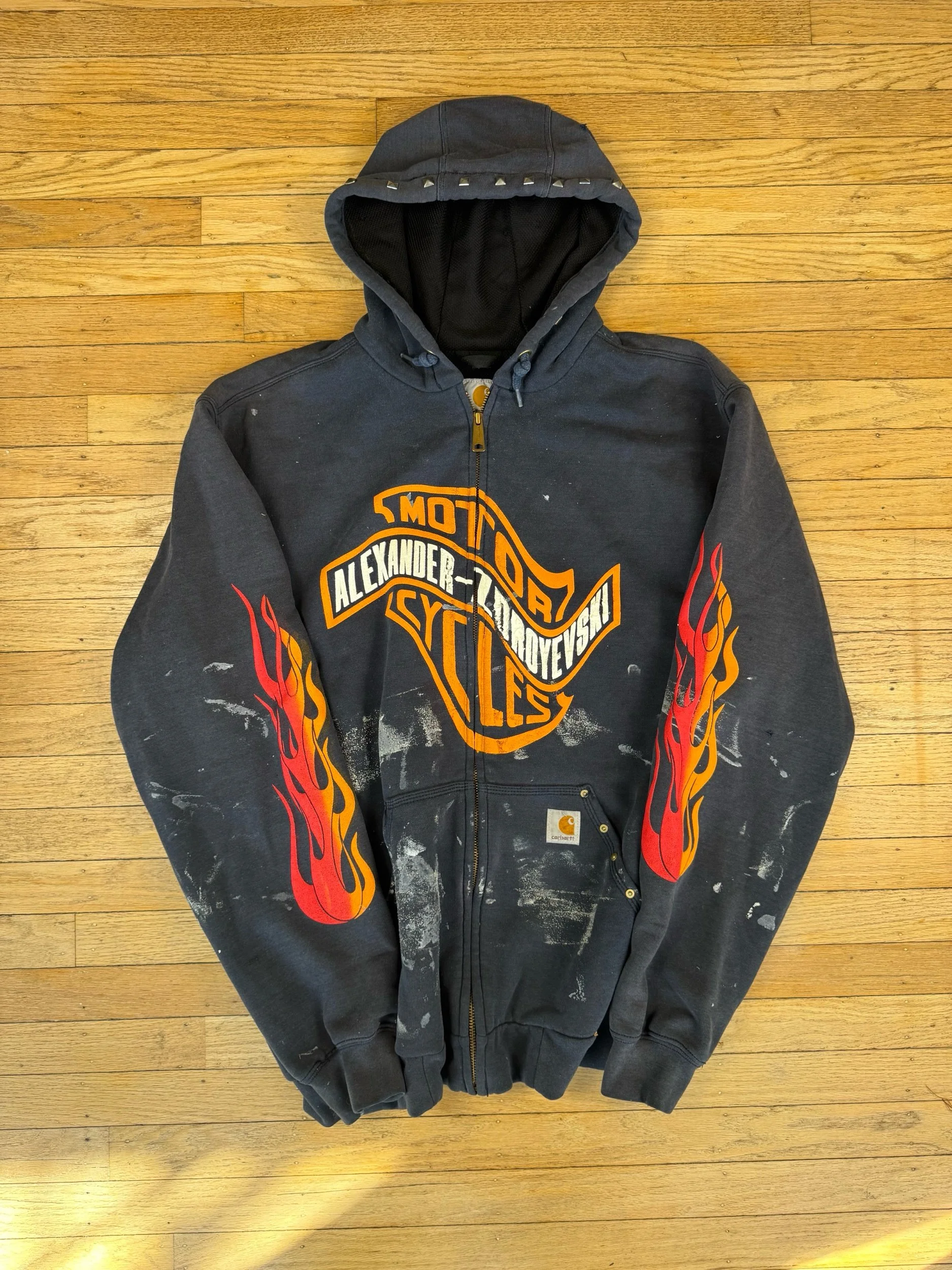 Hand pressed Rivets and studs around pocket and hood