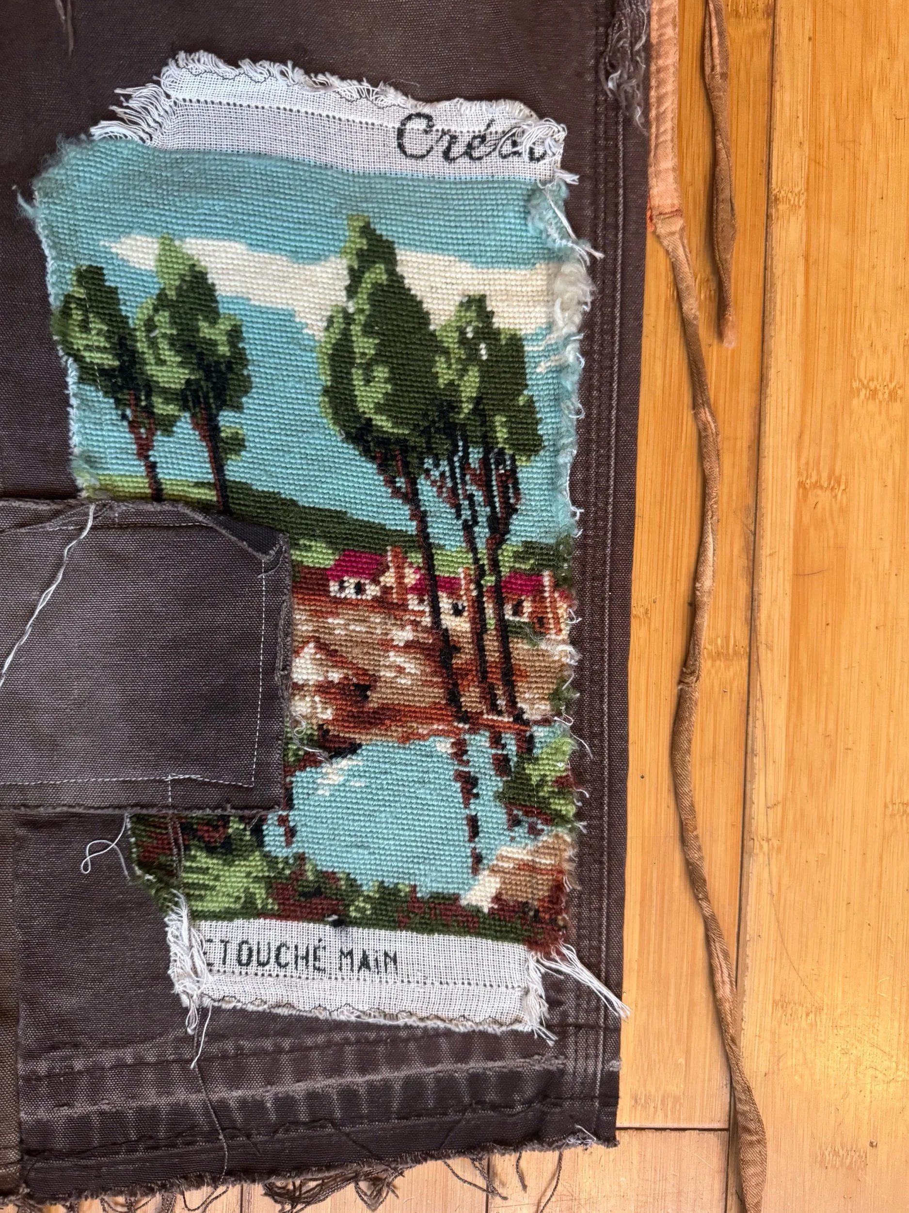 Vintage work pants , deconstructed, and reshaped using matching fabric covered in a collection of rare fabrics from aprons bank bags, hand embroidered paintings. Distressed and repaired throughout