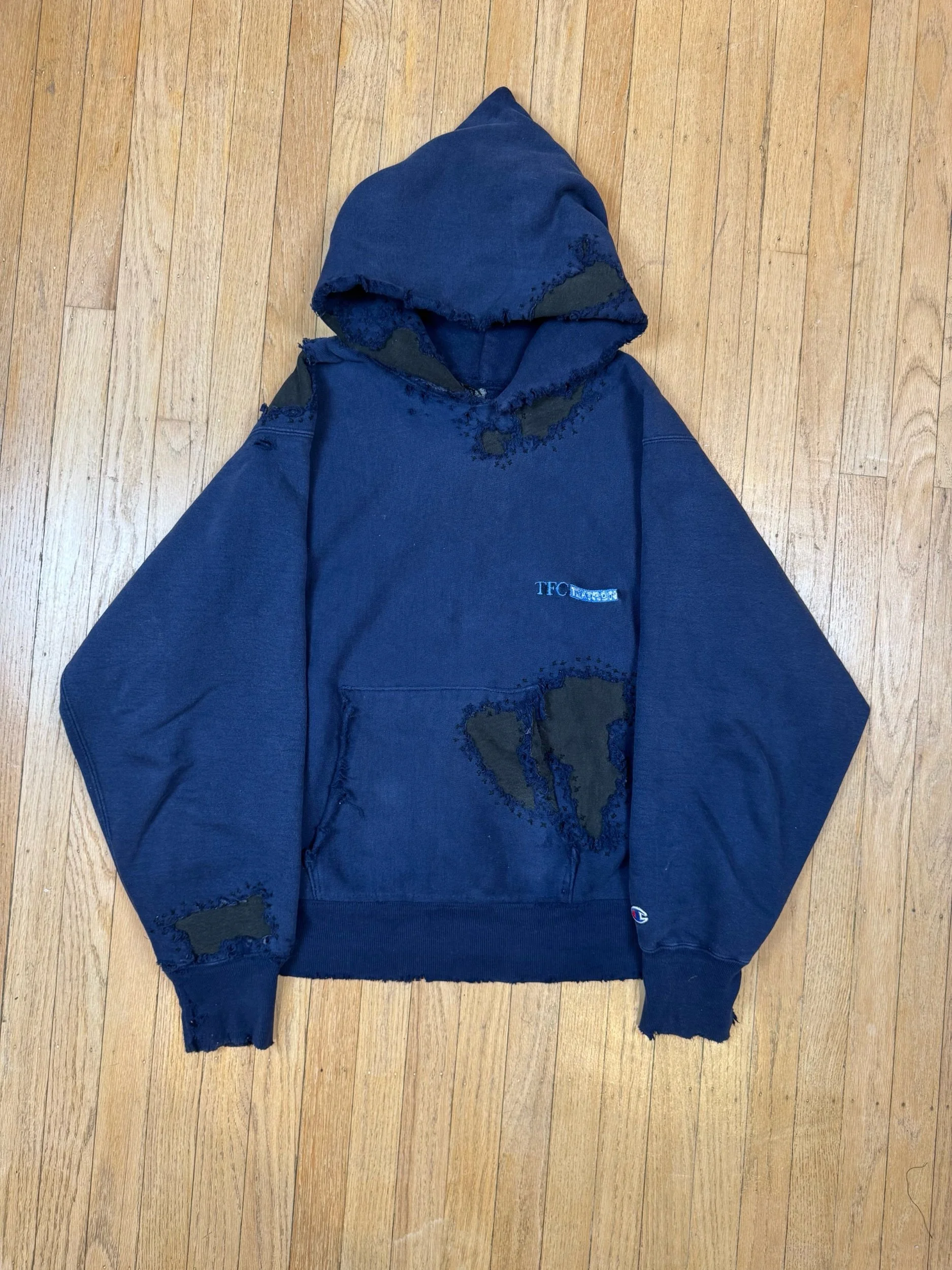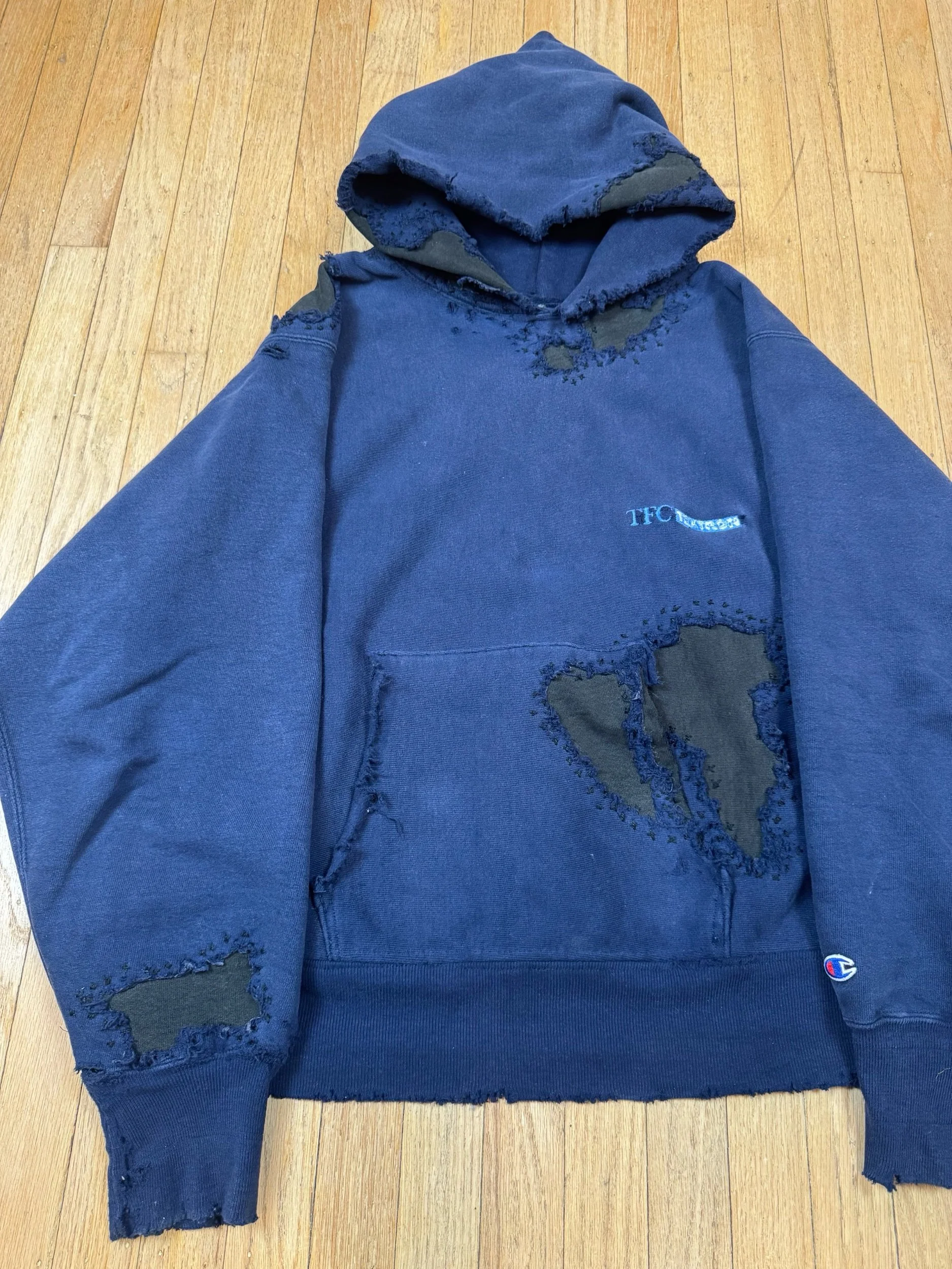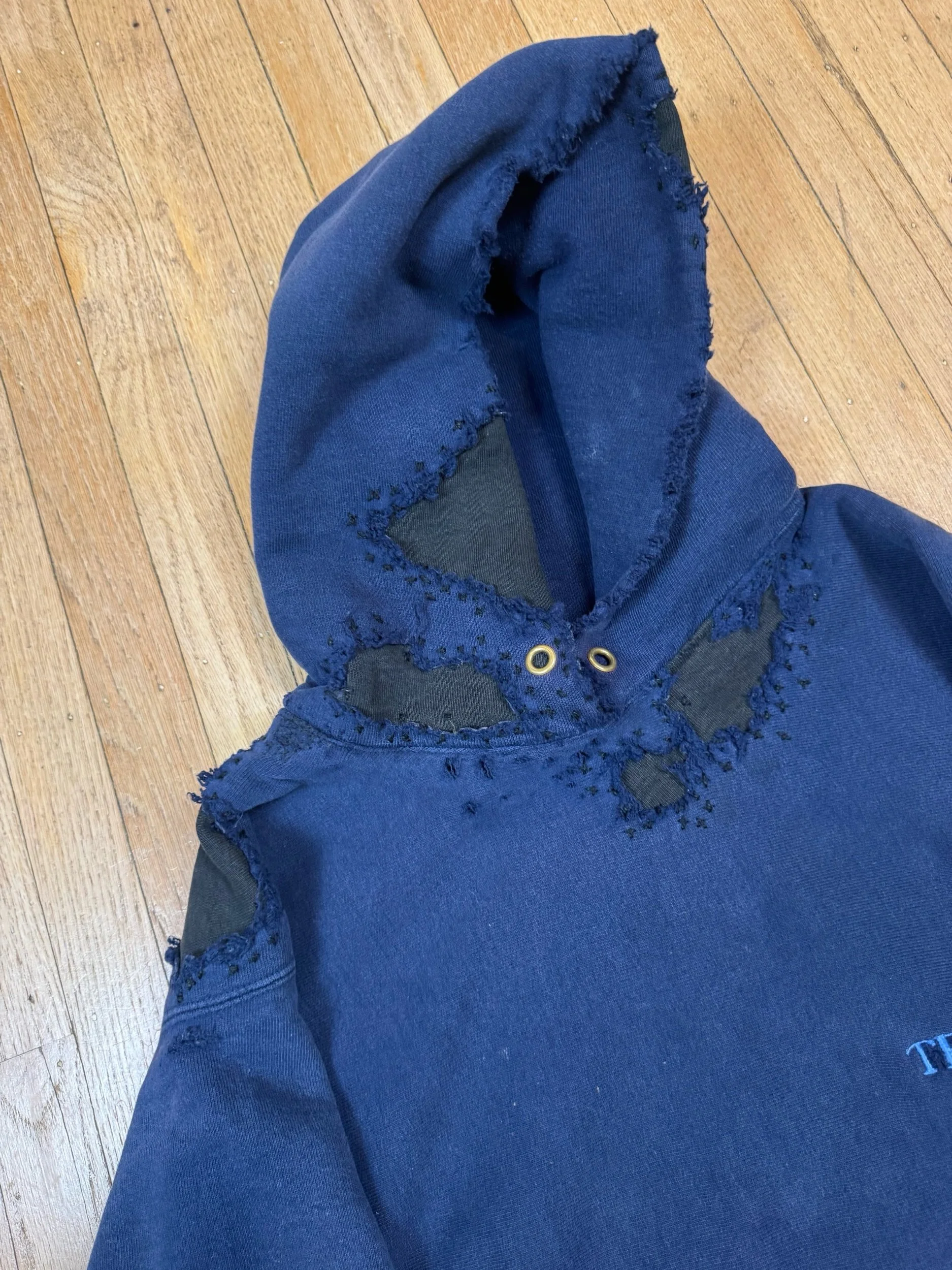 Vintage champion, reverse, weave hoodie Reshaped for a more boxy fit, distressed throughout and repaired using hand stitching