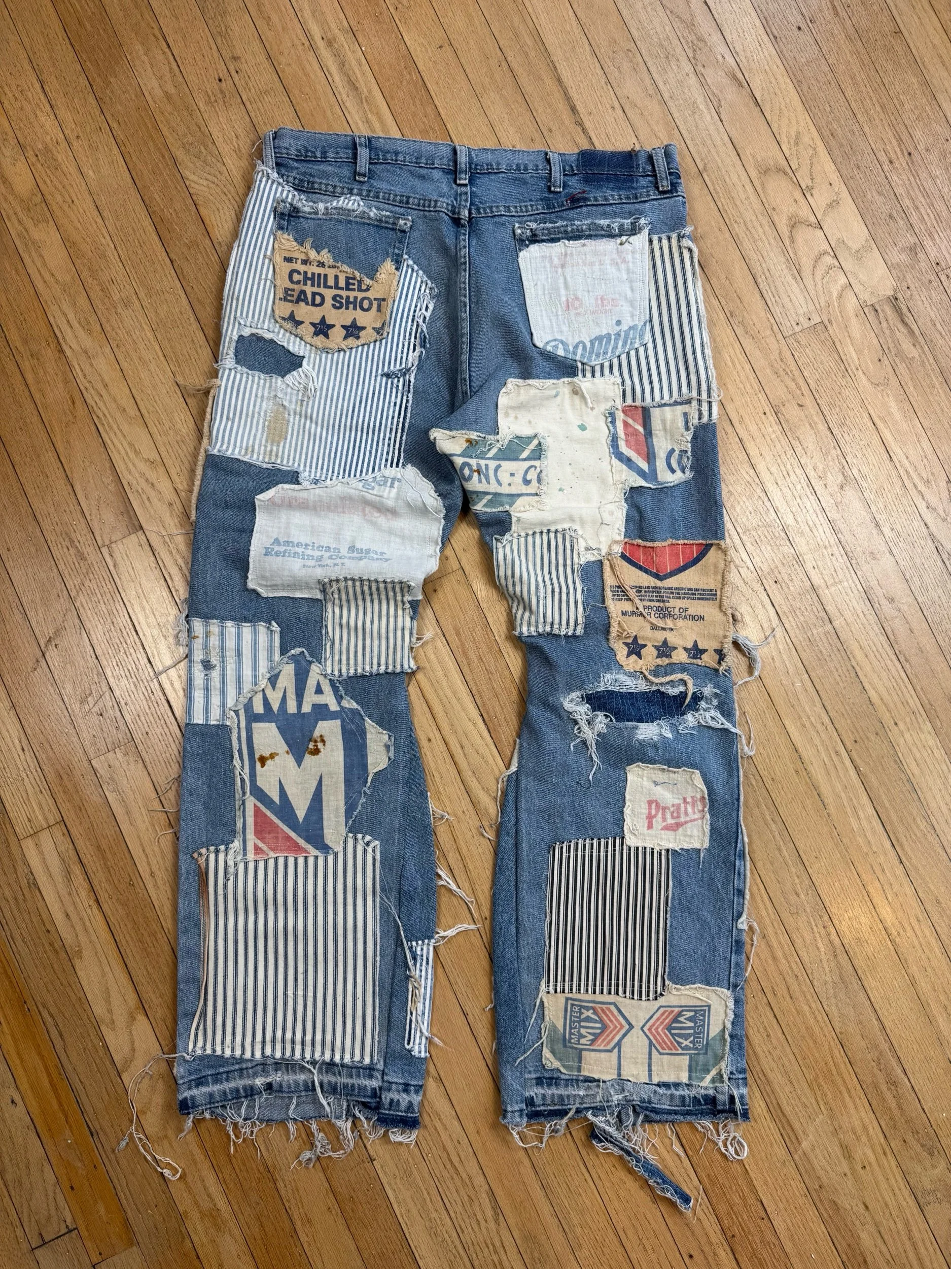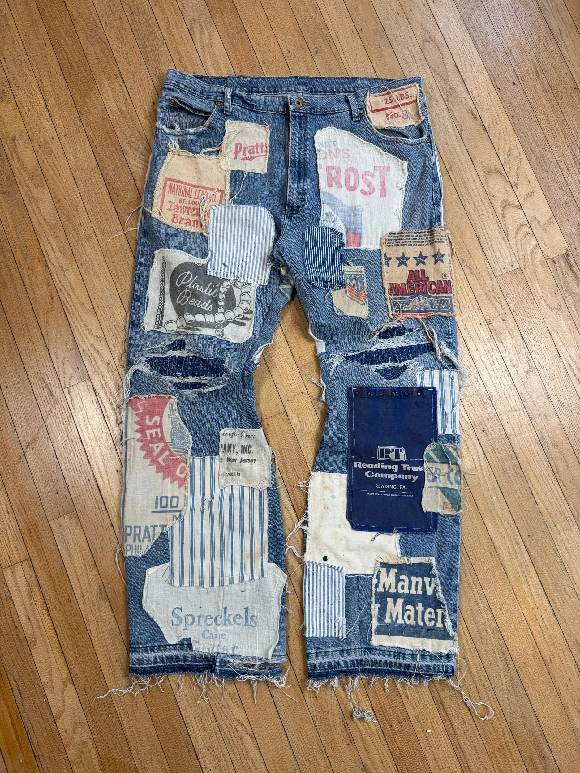 Vintage denim, deconstructed and reshaped using matching faded, denim, distressed, and repaired using a darning Stitch technique Then covered in old vintage fabrics from farm seed bags to bank bags.