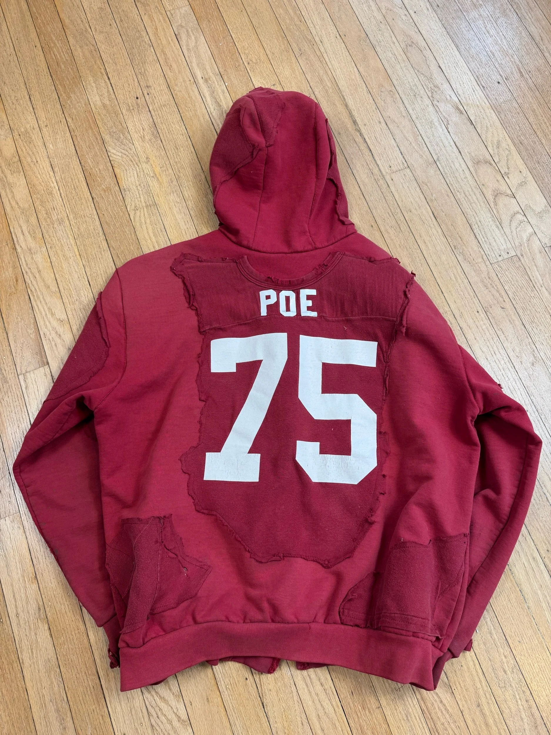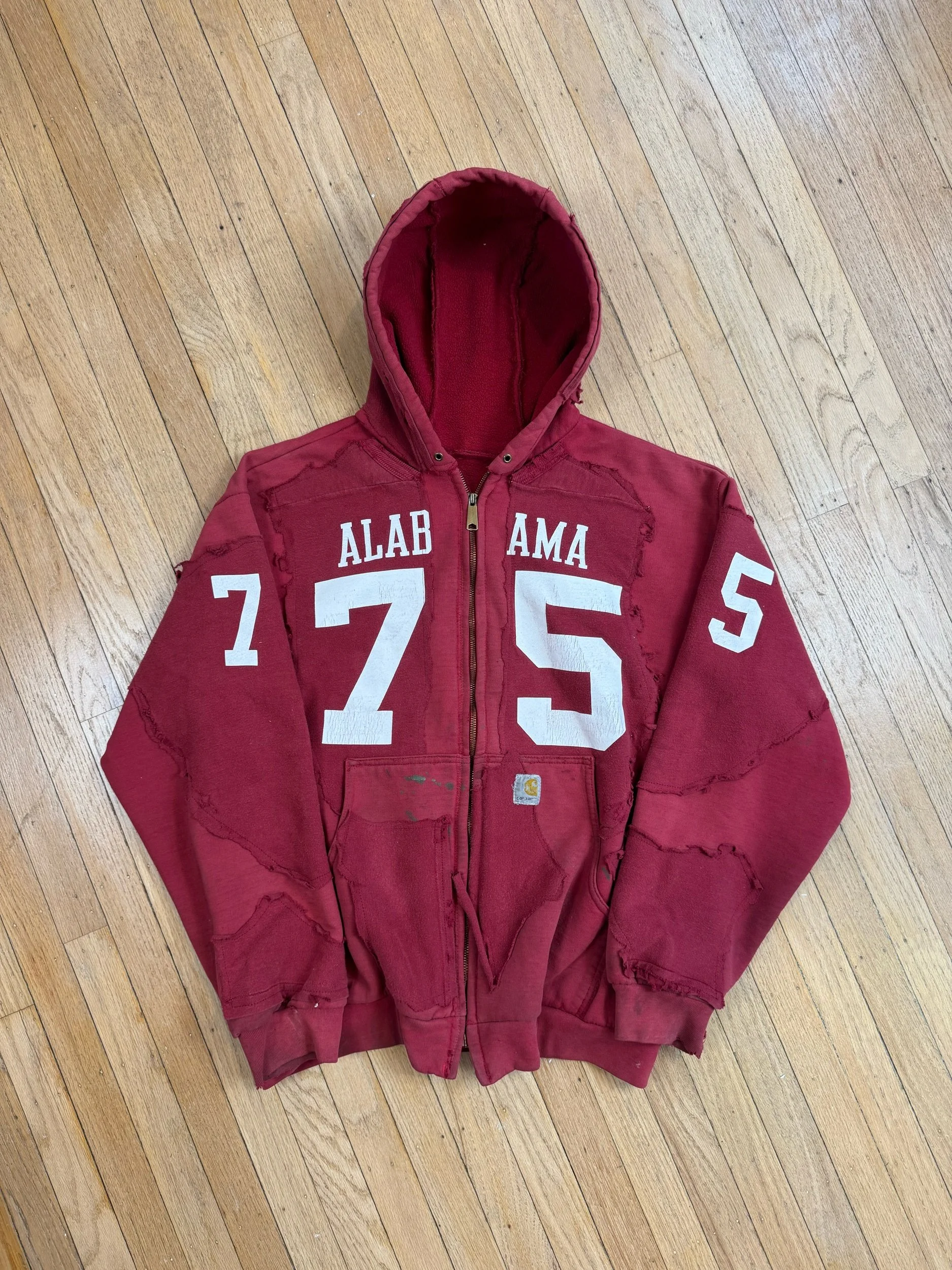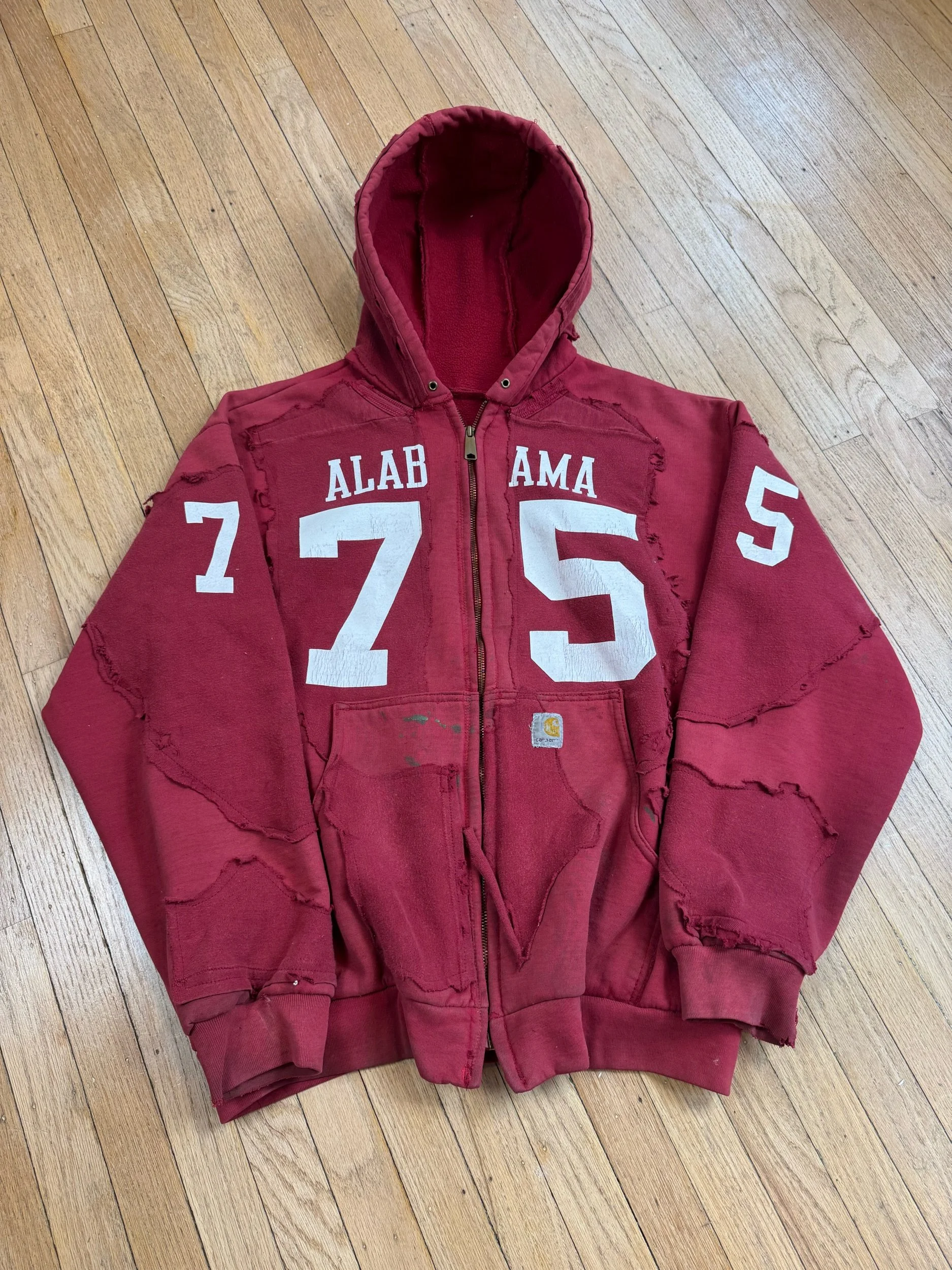 Vintage sun faded and distressed Carhartt hoodie, completely deconstructed, vintage cotton football jersey layered over and sewn down.
