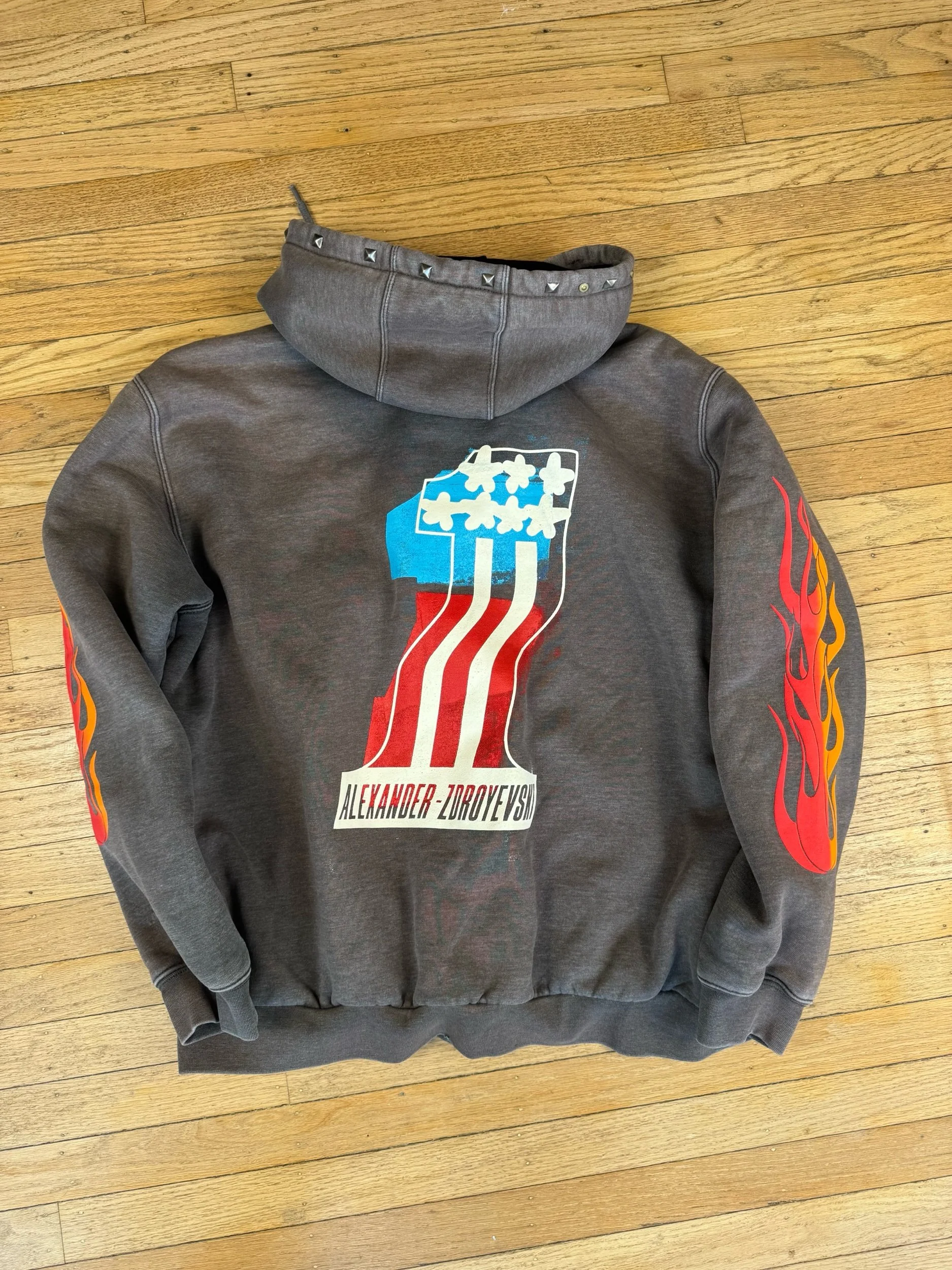 Hand pressed Rivets and studs around pocket and hood
