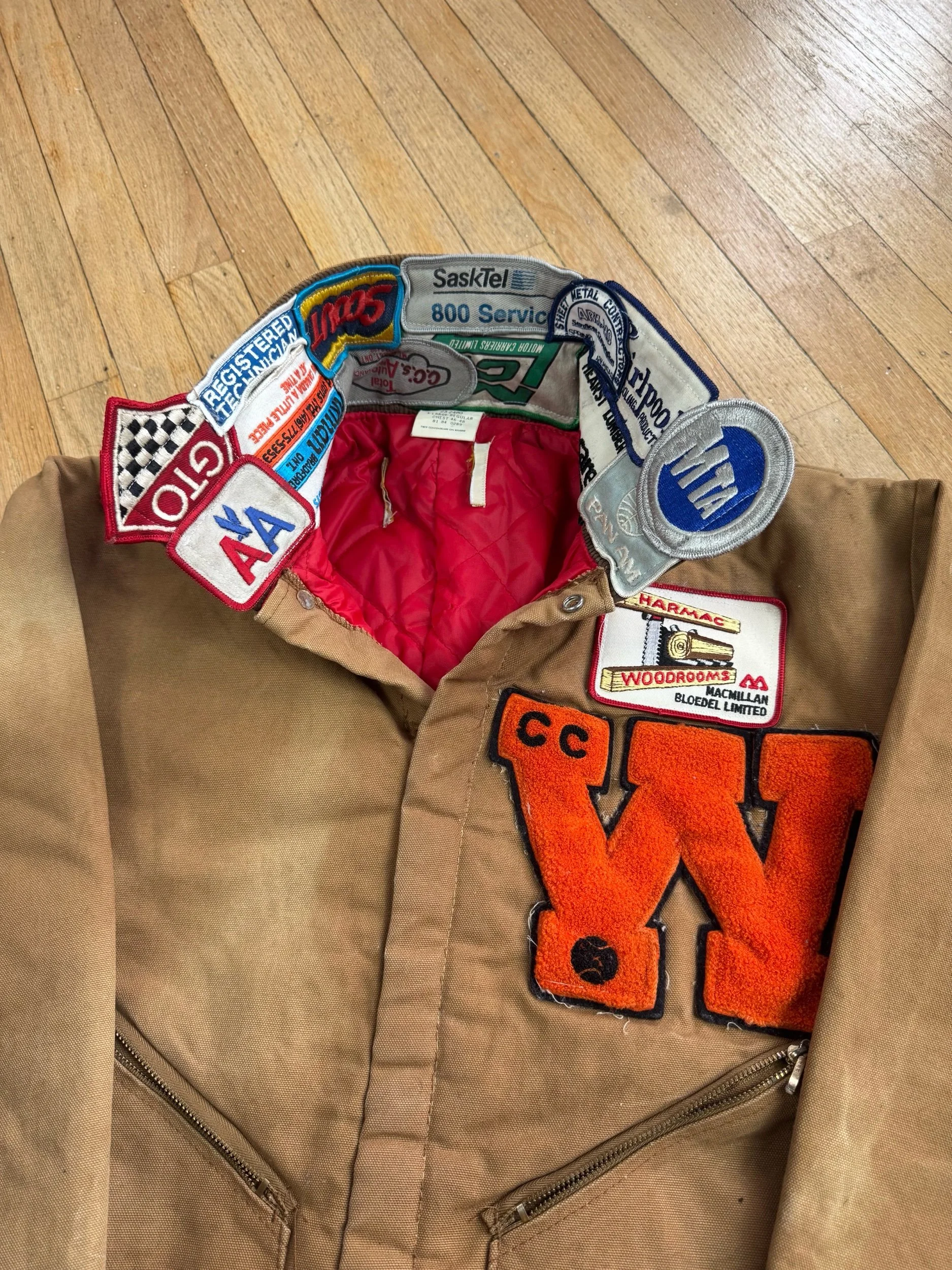 Vintage Carhartt style coveralls cropped into a jacket with repaired button closure, then covered in a curated collection of vintage patches